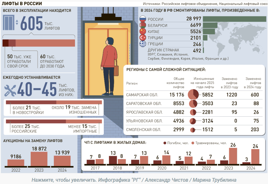Петр Харламов: Для домов до 30 этажей, по высоте это около 100 метров, российские производители вместе с белорусским заводом, который когда-то был построен, чтобы делать лифты для всего СССР, полностью закрывают потребности в лифтах. У нас около 30 производителей. В 2024 году было смонтировано около 29 тыс. лифтов российских производителей и около 6,7 тыс. - из Могилева. При этом производства загружены не полностью, российские предприятия могут выпускать более 60 тыс. лифтов в год. Даже с учетом новостроек, куда сейчас устанавливается более 20 тыс. лифтов ежегодно, резервы есть.