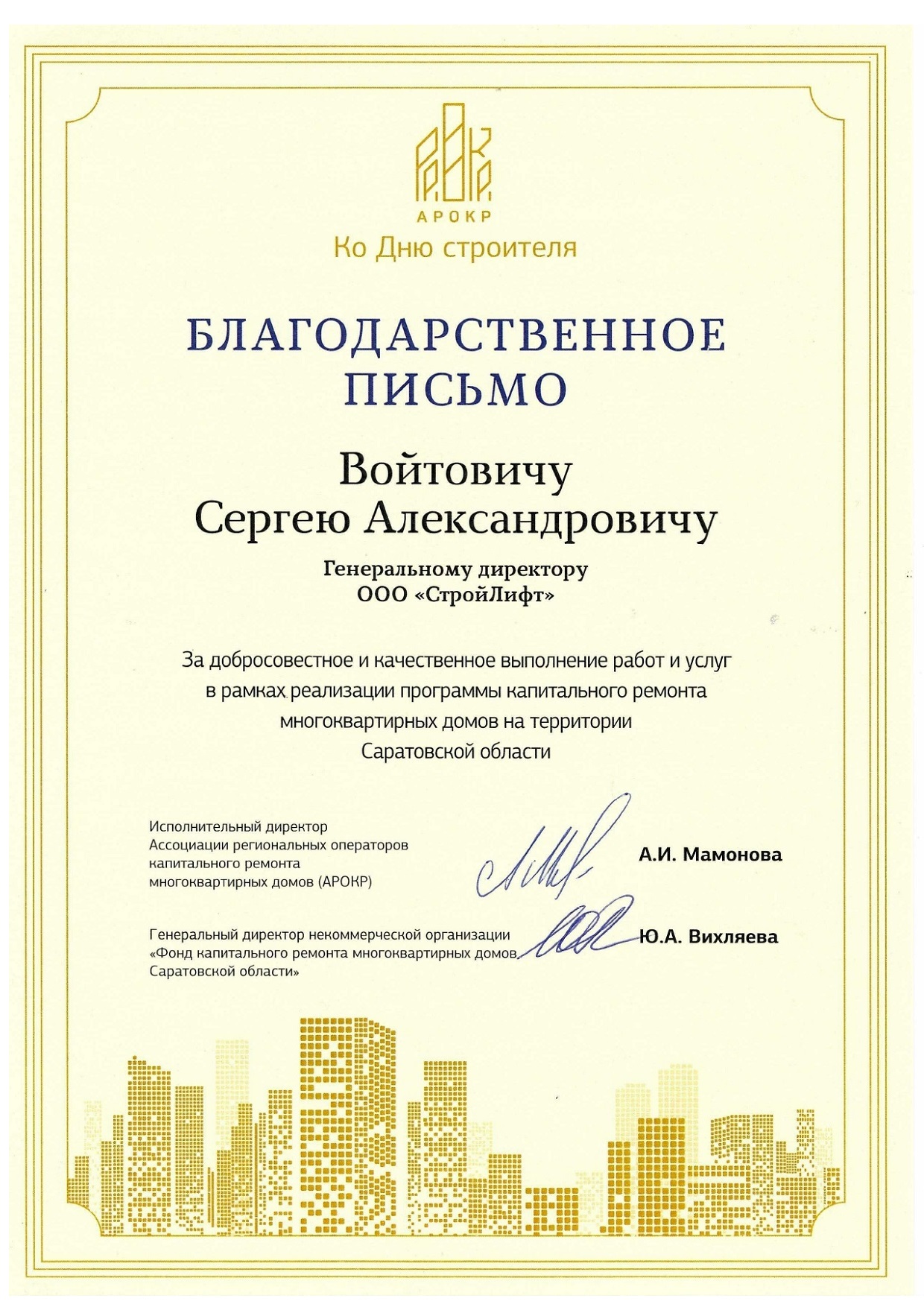 Благодарственное письмо ко дню строителя