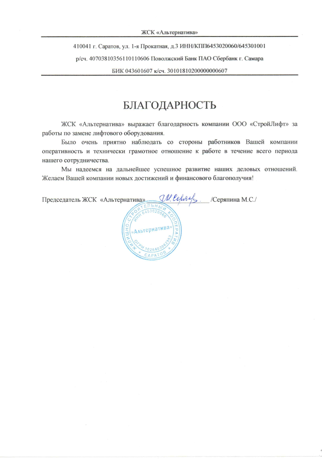 Благодарность ООО ПпС Лесстр