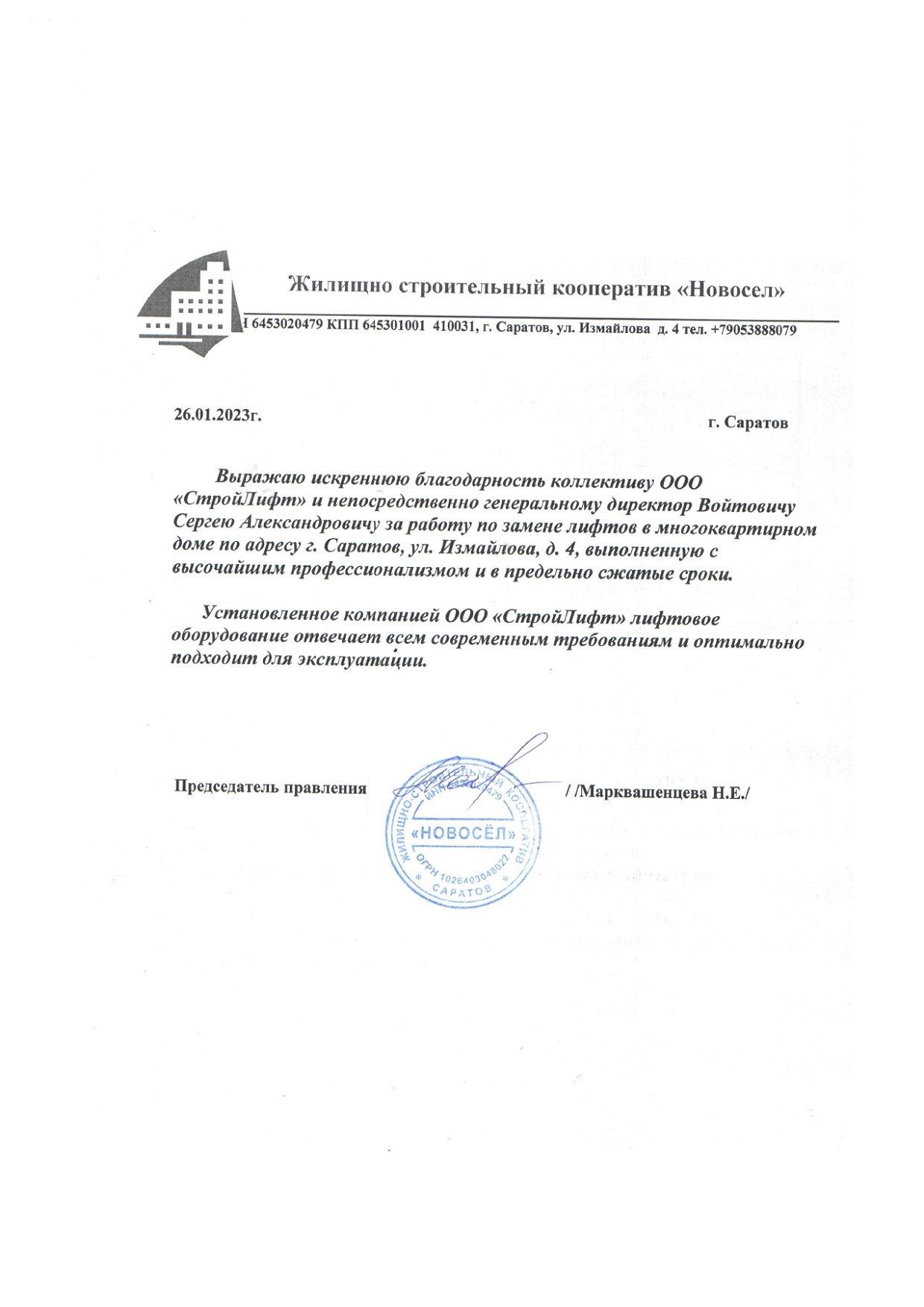 Благодарность Новосел